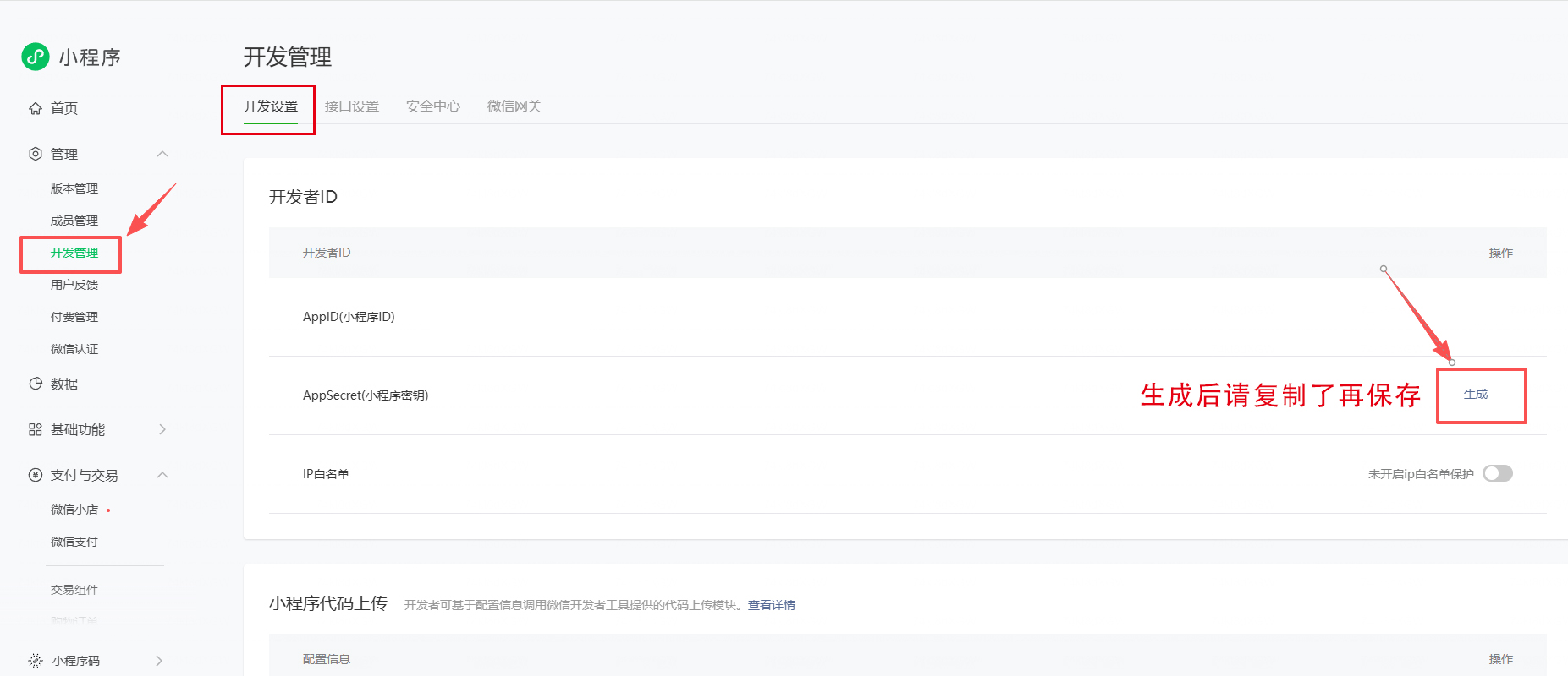点击开发设置,下面的生成按钮,点击生成小程序密钥,如下图: