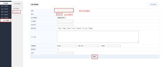 1、选择菜单门店管理-设计师管理-设计师添加中,上传对应信息,带※为必填项,未带※为选填项,填写完成后保存即可。