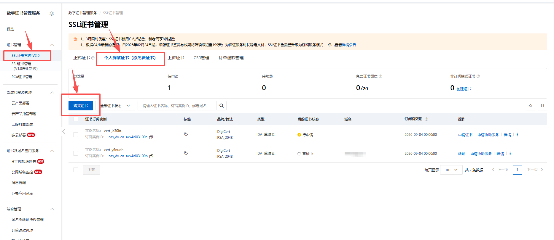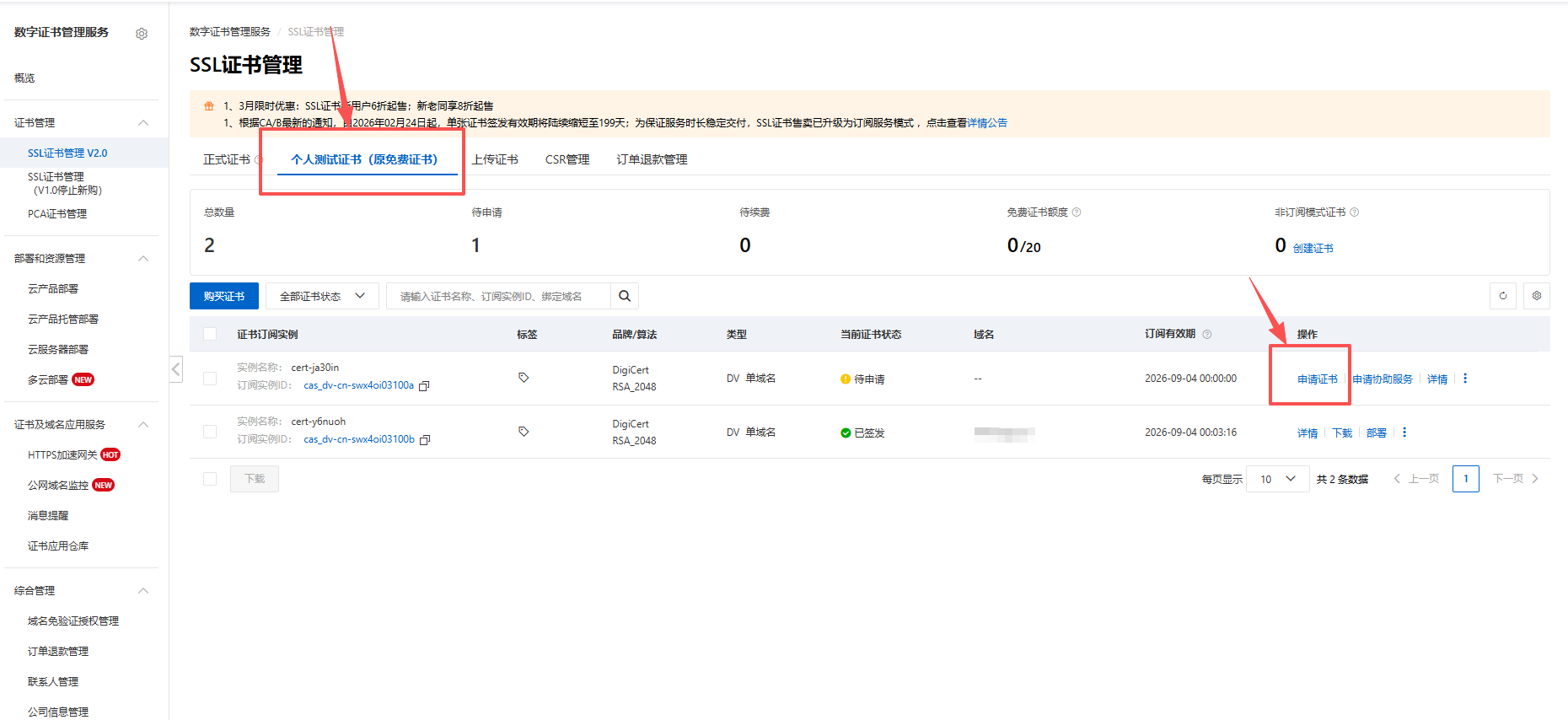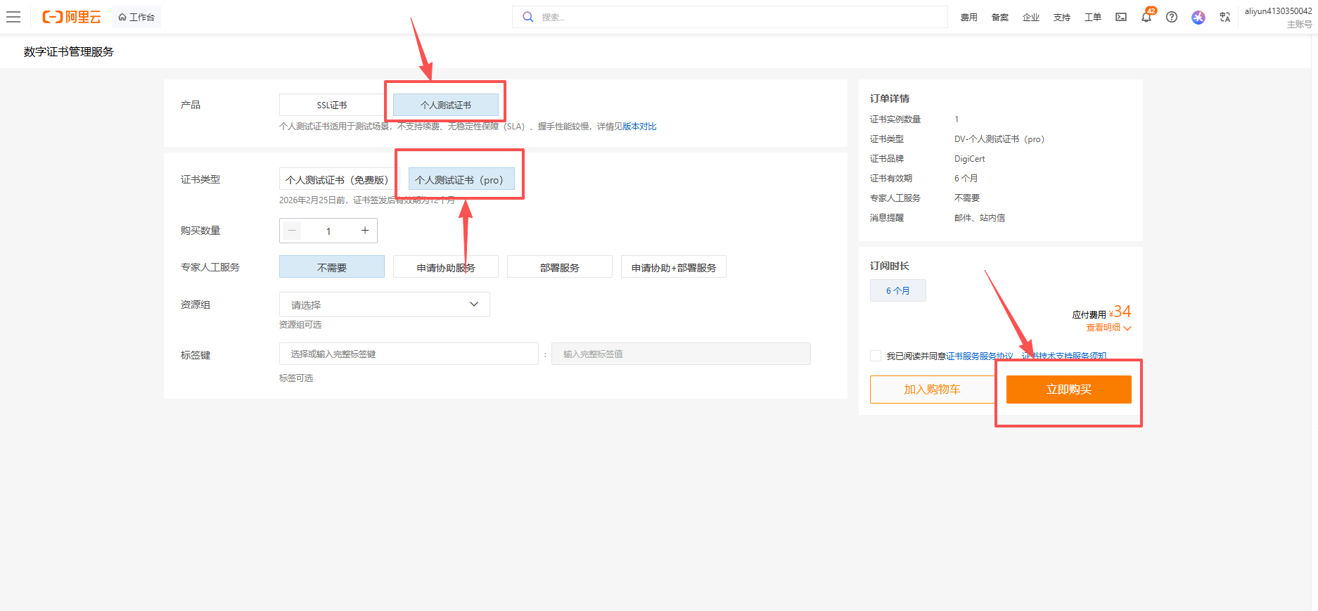 2、进入后选择“个人测试证书”=>>购买证书=>>选择“个人测试证书(pro)”(价格请以实际显示价格为准。)