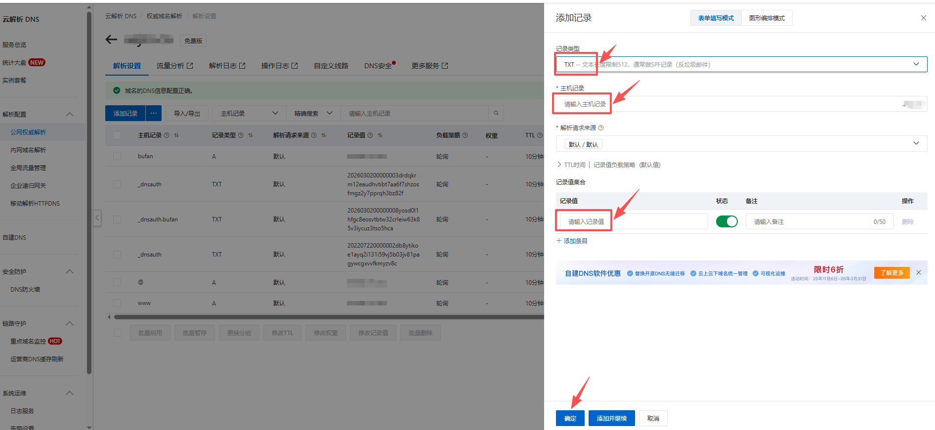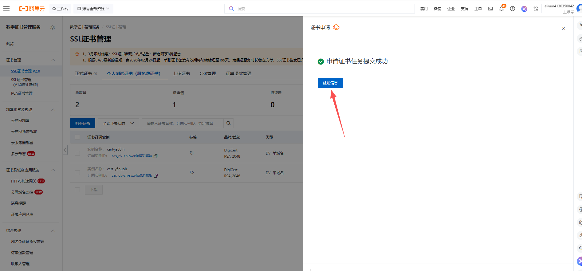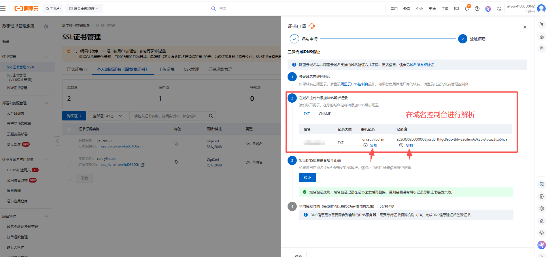 4、DNS验证:提交审核后,点击“验证信息”按钮,需显示验证通过,会涉及到在域名控制台解析,解析完成后返回证书申请页点击“验证”,显示域名验证成功即可,如下图: