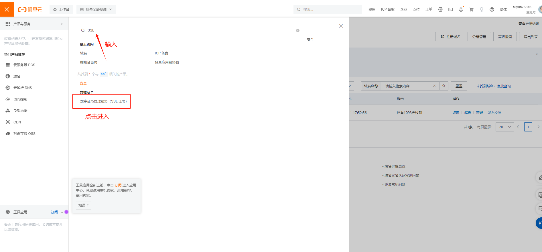 1、在阿里云左上角点击菜单栏——搜索框输入SSL——数字证书管理服务(SSL 证书),如下图