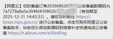 注意:此数据码在提交ICP备案时会选择是否授权,如果选择了授权,ICP备案成功后,负责人会收到短信。查看短信样式